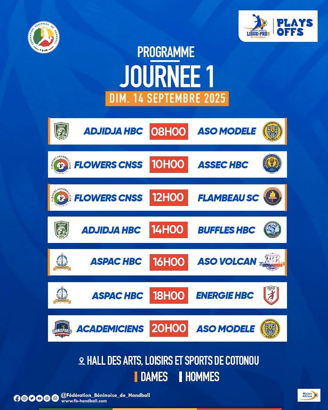 Ce dimanche 14 septembre 2025, démarre au Hall des Arts, Loisirs et Sports de Cotonou, les matchs des Play-Offs de la Moov Africa Ligue Pro1 2025 de handball. Au total, 7 matchs du côté des dames et hommes sont programmés.