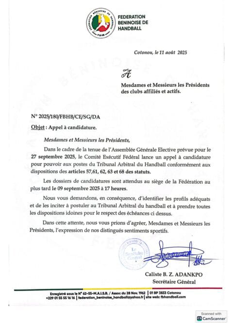 La Fédération Béninoise de Handball lance un appel à candidatures pour pourvoir les postes au sein du Tribunal Arbitral du handball. Ce tribunal sera chargé de veiller à la bonne application des règlements et à la résolution des litiges sportifs, contribuant ainsi à la crédibilité et à la transparence du handball national.