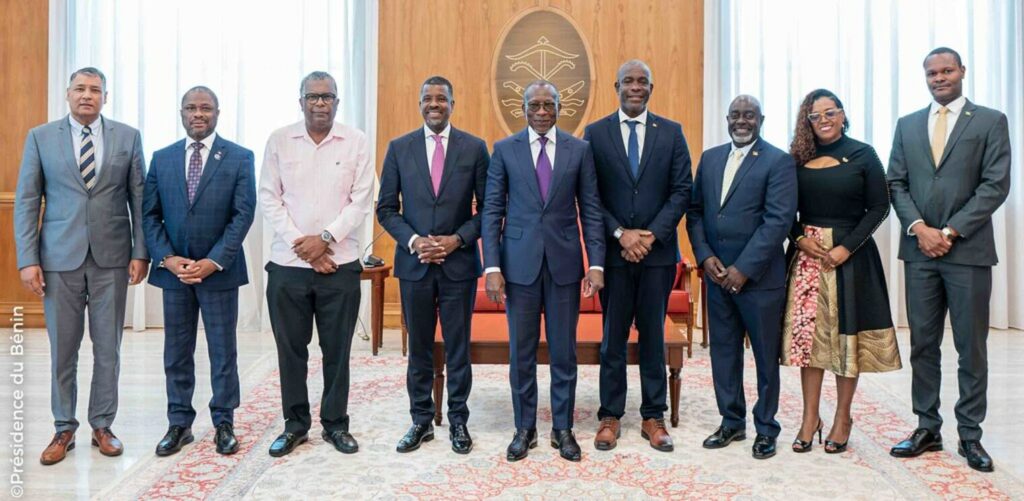 La délégation est allée remercier le Chef de l’État Patrice Talon et recevoir des conseils du Président pour la pérennisation des actions qui auront un impact direct sur les économies des pays concernés et leurs populations. La délégation était composée des États-membres de la Communauté des Caraïbes, notamment les Ministres des Affaires étrangères d’Haïti, de la Dominique, des Bahamas et de la Grenade ainsi que les ambassadeurs d’Antigua-et-Barbuda, de la Barbade, de la République du Suriname et de la Jamaïque.