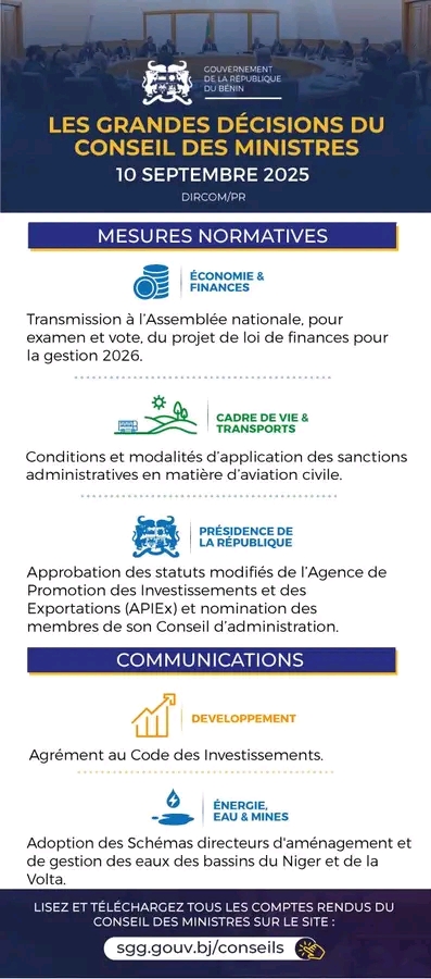 D5-Presidence benin ActuPolitique Bénin : Les grandes décisions du conseil des ministres de ce mercredi 10 septembre 2025 By Rédaction On Sep 10, 2025 Share Le conseil des ministres s’est réuni ce mercredi 10 septembre 2025, sous la présidence du chef de l’État, Patrice Talon. Voici les grandes décisions issues de cette rencontre de l’exécutif ActuBéninConseil des ministres du 10 septembre 2025Politique Share FacebookTwitterGoogle+ReddItWhatsAppPinterestEmail