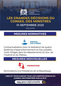 Bénin : Les grandes décisions du conseil, des ministres de ce mercredi 1re Octobre 2025