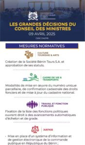 ActuPolitique Bénin : Voici les grandes décisions du conseil des ministres de ce mercredi 09 avril 2025 By Rédaction Last updated Avr 9, 2025 Share Les grandes décisions du conseil des ministres de ce 09 avril 2025. ActuBéninConseil des ministres de ce mercredi 09 Avril 2025Grandes décisionsPolitique Share FacebookTwitterGoogle+ReddItWhatsAppPinterestEmail