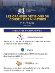 ActuPolitique Bénin : Voici les grandes décisions du conseil des ministres de ce mercredi 14 mai 2025 By Rédaction On Mai 14, 2025 Share Grandes décisions ActuConseil des ministres de ce mercredi 14 mai 2025Patrice TalonPolitique Share FacebookTwitterGoogle+ReddItWhatsAppPinterestEmail