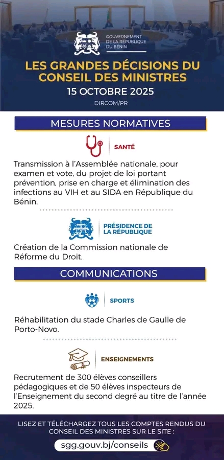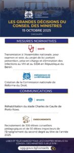 ActuPolitique Bénin : Voici les grandes décisions du conseil des ministres de ce mercredi 15 octobre 2025 By Rédaction Last updated Oct 15, 2025 Share Le conseil des ministres s’est réuni ce mercredi 15 octobre 2025, sous la présidence du chef de l’État, Patrice Talon. Voici les grandes décisions ActuBéninConseil des ministres de ce mercredi 15 octobre 2025Patrice TalonPolitique Share FacebookTwitterGoogle+ReddItWhatsAppPinterestEmail