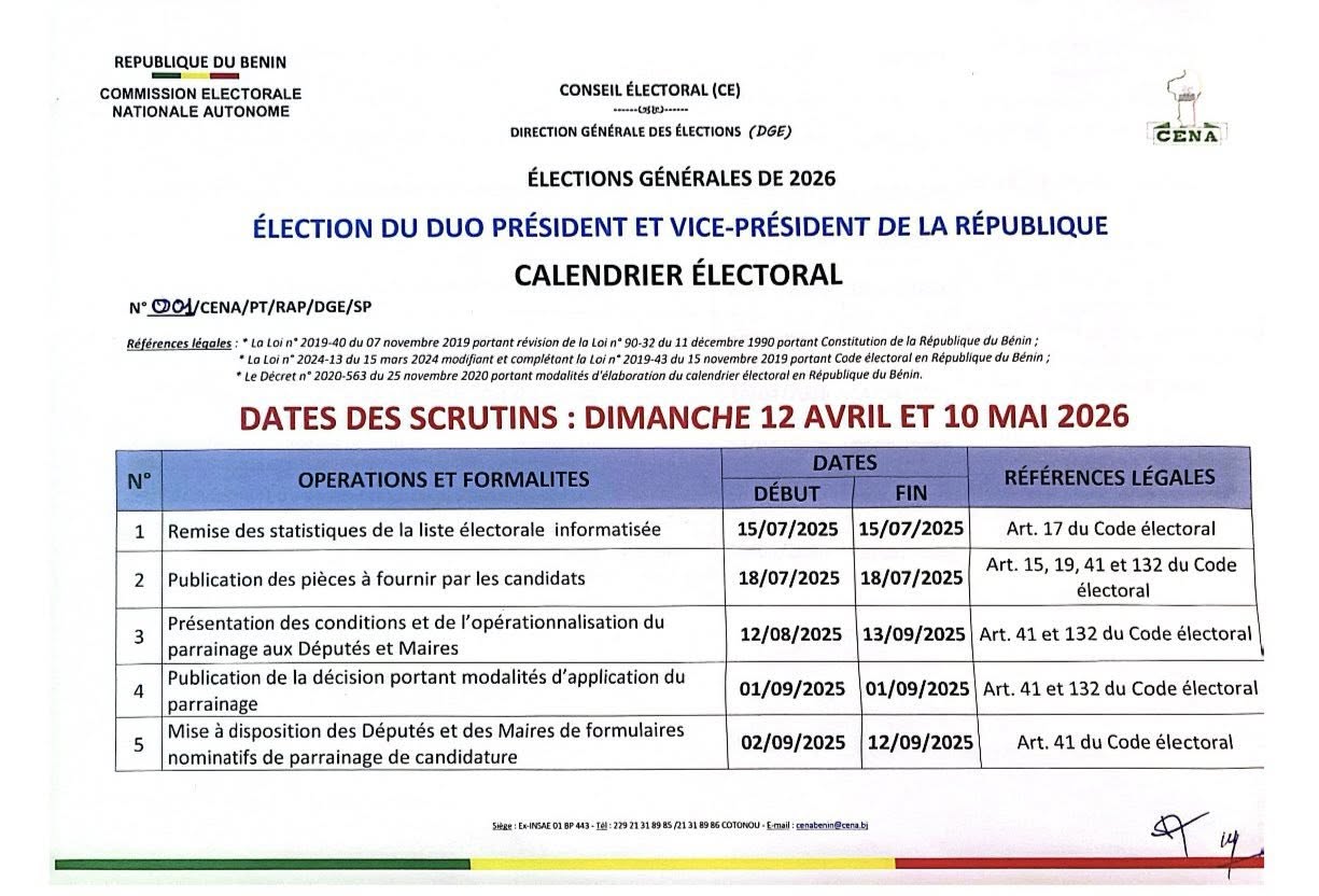 La Commission Électorale Nationale Autonome (CENA) a publié, le 8 août 2025, le calendrier officiel de l’élection présidentielle prévue en 2026. Ce calendrier annonce les grandes dates du processus électoral dont les deux tours se tiendront respectivement le 12 avril et le 10 mai 2026.