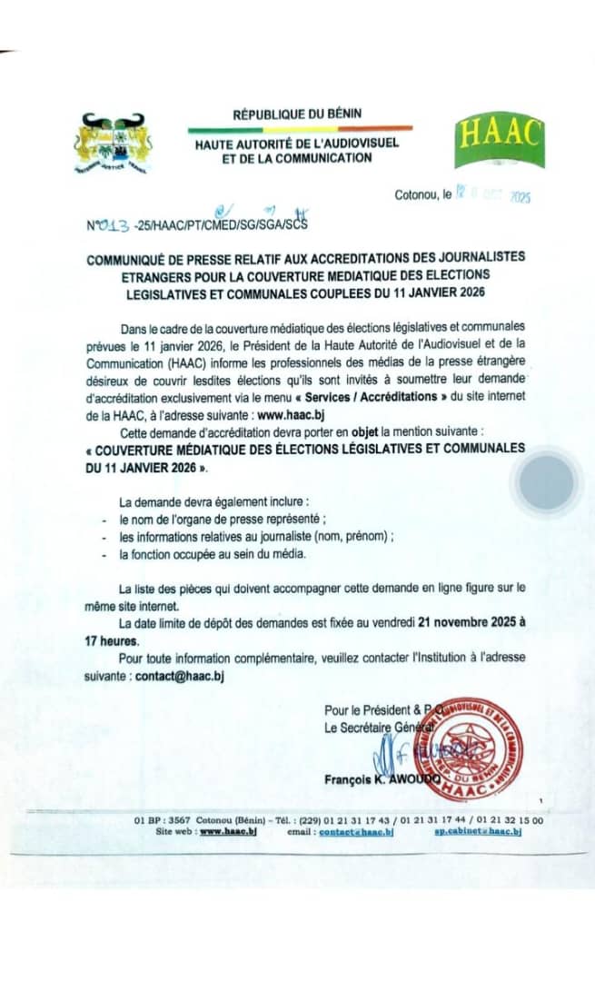 Par communiqué, la Haute Autorité de l’Audiovisuel et de la Communication (HAAC) a lancé le processus d’accréditation des journalistes étrangers pour la couverture médiatique des élections couplées législatives et communales de janvier 2026.