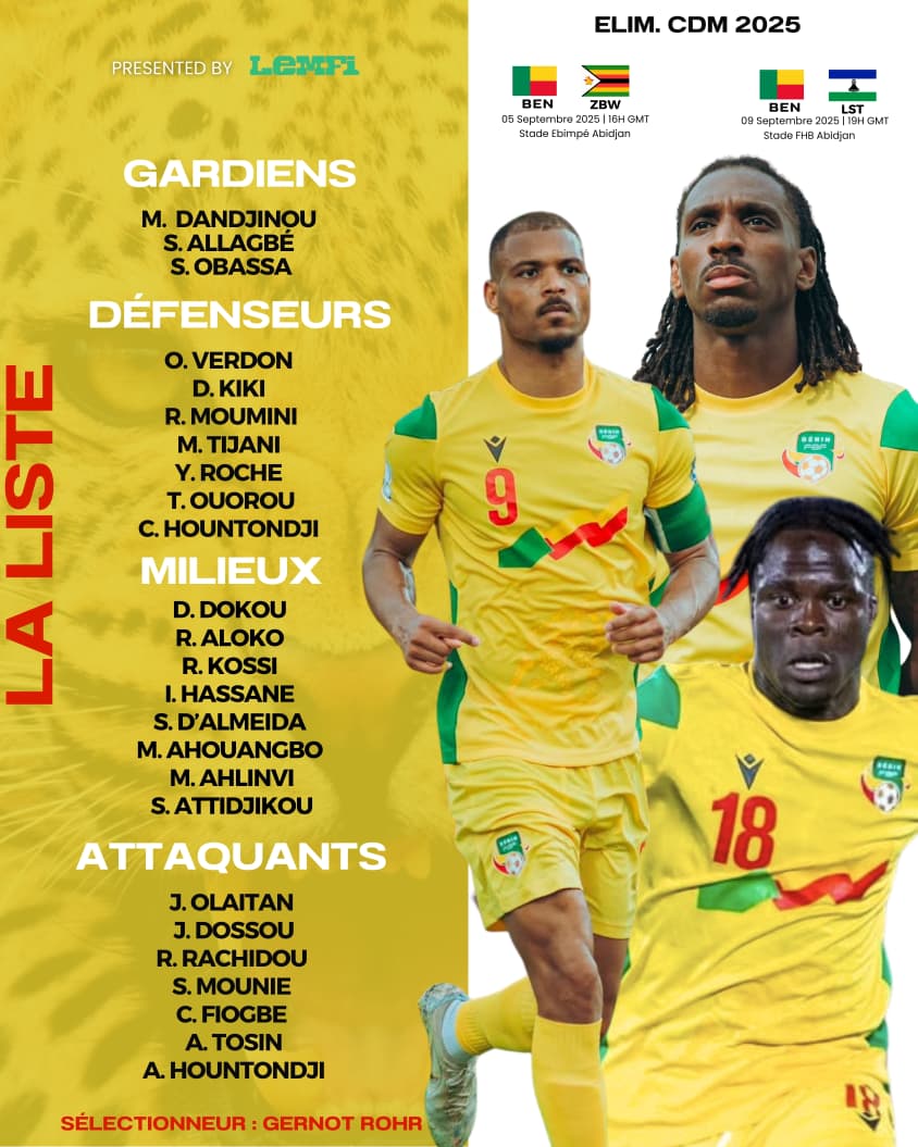Le sélectionneur des Guépards du Bénin Gernot Rohr a dévoilé ce jeudi 28 août 2025, la liste des joueurs devant affronter le Zimbabwe et le Lesotho dans le cadre des éliminatoires de la Coupe du Monde de la FIFA 2026. La liste a été dévoilée lors d’une conférence de presse tenue à Cotonou.