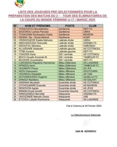 Dans le cadre des éliminatoires de la coupe du monde féminin U-17, les Guépardes du Bénin sont annoncées dans une double confrontation avec la République Démocratique du Congo (RDC). La 1ere rencontre aura lieu le 09 mars 2025 au Bénin et la 2nd rencontre va se disputer le 16 mars 2025 en RDC. En prélude à cette double confrontation, la selectionneure Ida Azonsou a dévoilé la liste des 26 Amazones convoquées pour défendre les couleurs nationales.