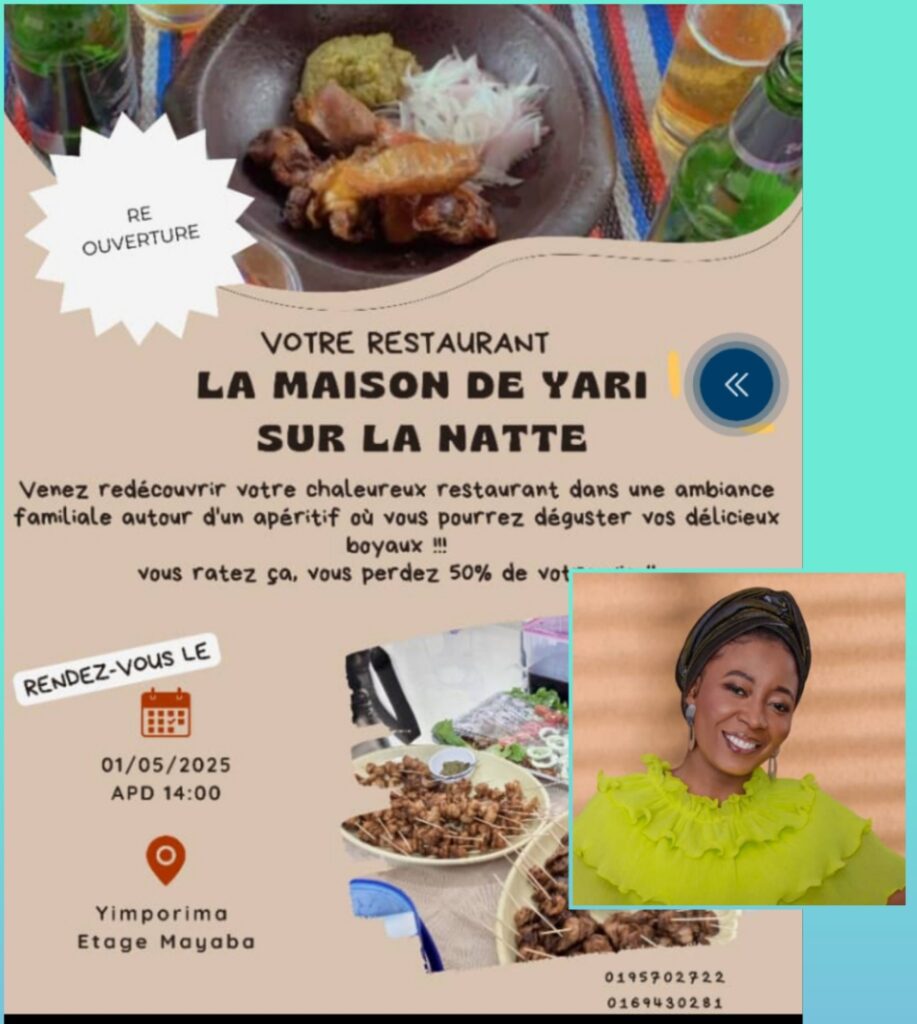 Après un court séjour d’inactivité, le bar restaurant « La Maison de Yari » Aka « Sur La Natte » informe son aimable clientèle de la réouverture de ses locaux ce jeudi 1er Mai 2025.