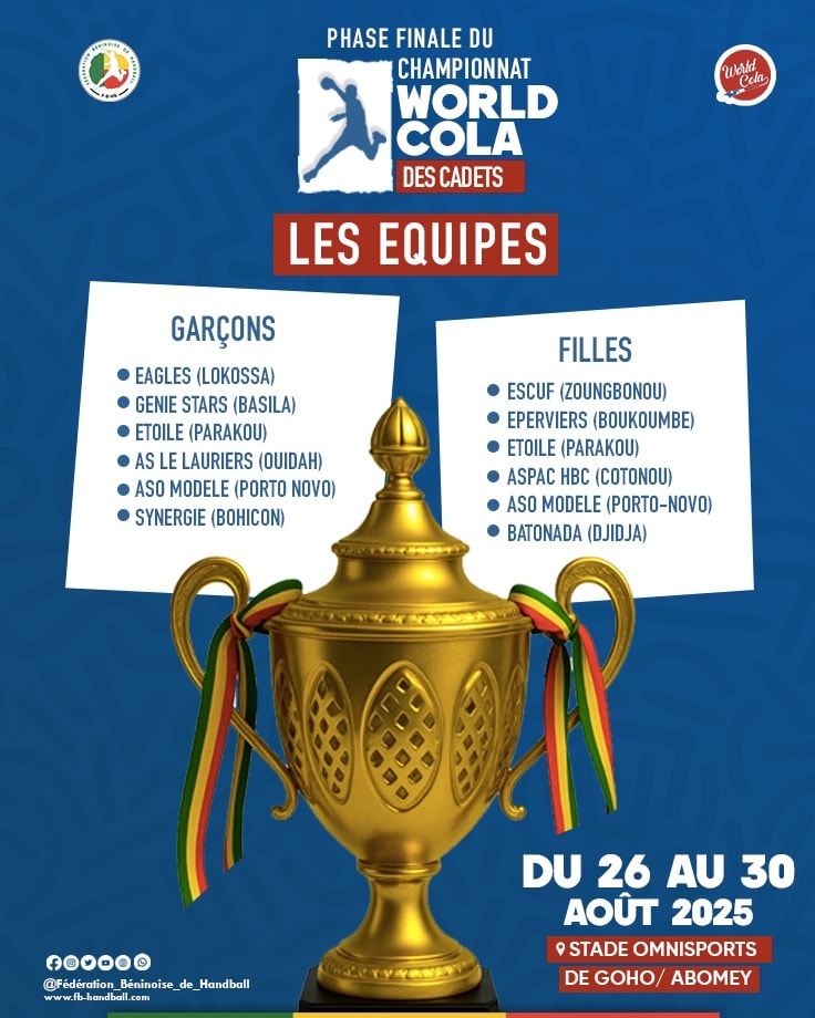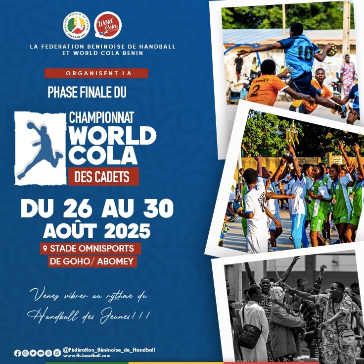 Du 26 au 30 août 2025, Abomey accueille la phase finale du championnat World Cola des cadets 2025. Les compétitions qui s’annoncent très électriques et palpitantes vont se jouer au Stade Omnisports de Goho, Abomey. Cette compétition est placée sous le leadership de la Fédération Béninoise de Handball. Le public est donc invité à sortir massivement pour la célébrer la fête du Handball avec les équipes qui vont s’affronter entre elles à savoir :