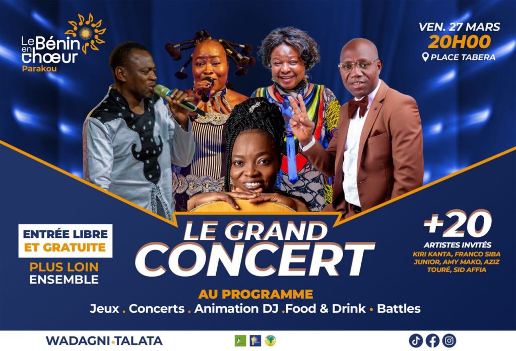 La ville de Parakou s’anime au rythme de la musique avec le concert « Le Bénin en chœur », un grand rendez-vous culturel organisé à la place Tabera. Prévu pour ce vendredi 27 mars 2026 à partir de 20 heures, l’événement marque le coup d’envoi de deux semaines de festivités dédiées à la musique et au divertissement.
