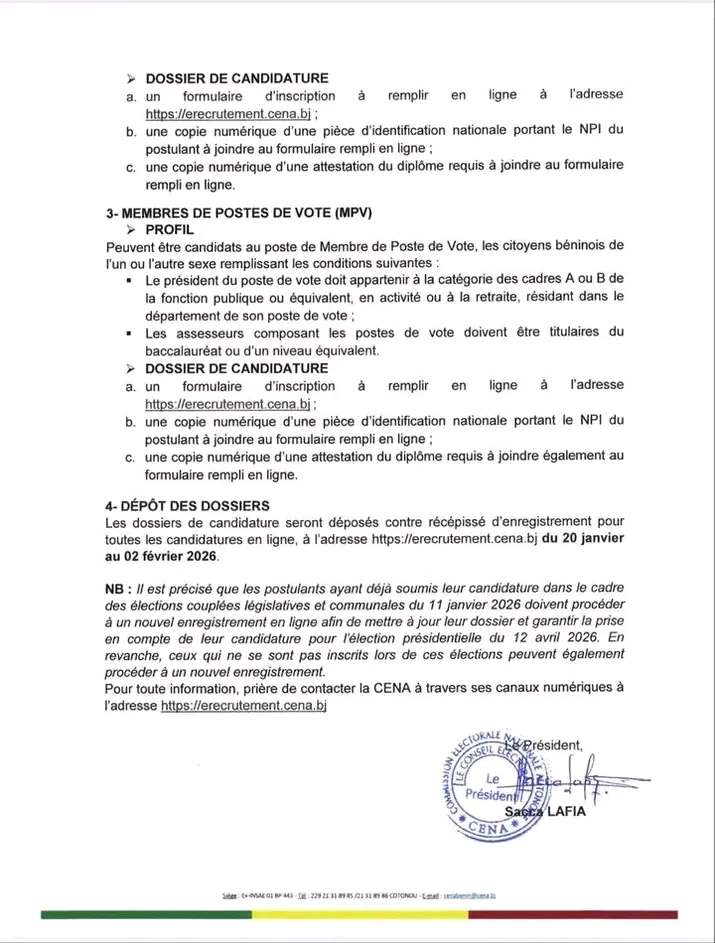 Conformément à la modernisation des processus électoraux au Bénin, le dépôt des dossiers se fera exclusivement par voie électronique. Les candidats ont jusqu’au lundi 2 février 2026 pour soumettre leurs pièces justificatives.