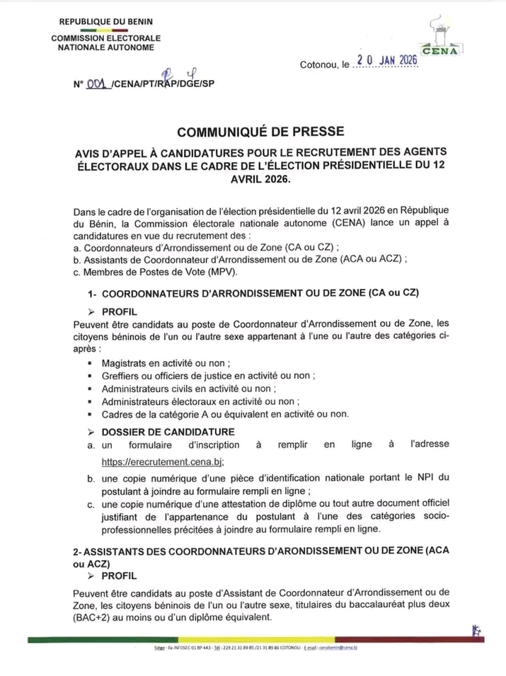 À moins de trois mois du premier tour de l’élection présidentielle, la Commission Électorale Nationale Autonome (CENA) passe à la vitesse supérieure. L’institution a officiellement ouvert, ce mardi 20 janvier 2026, le processus de recrutement du personnel de terrain pour le scrutin du 12 avril prochain.
