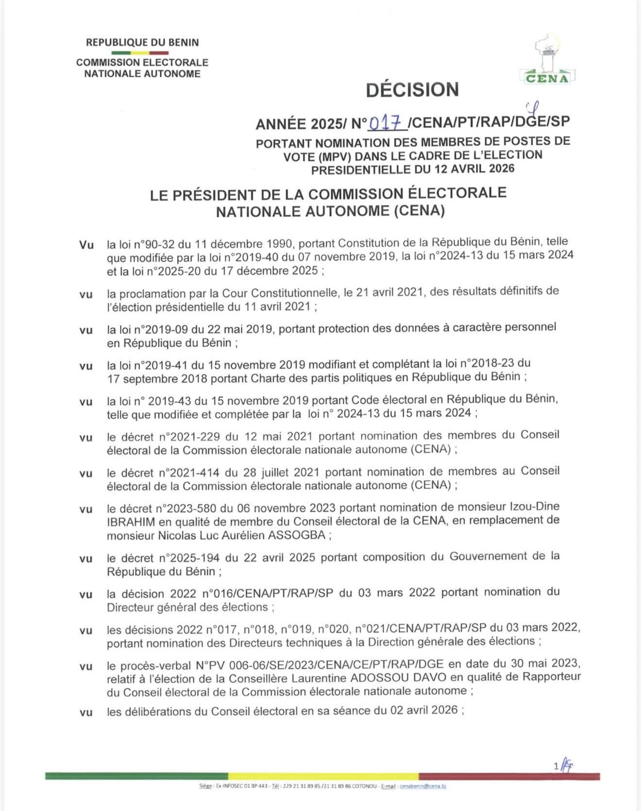 Dans le cadre de l’élection présidentielle prévue le dimanche 12 avril 2026, la Commission électorale nationale autonome (CENA) a rendu publique la liste des membres des postes de vote.