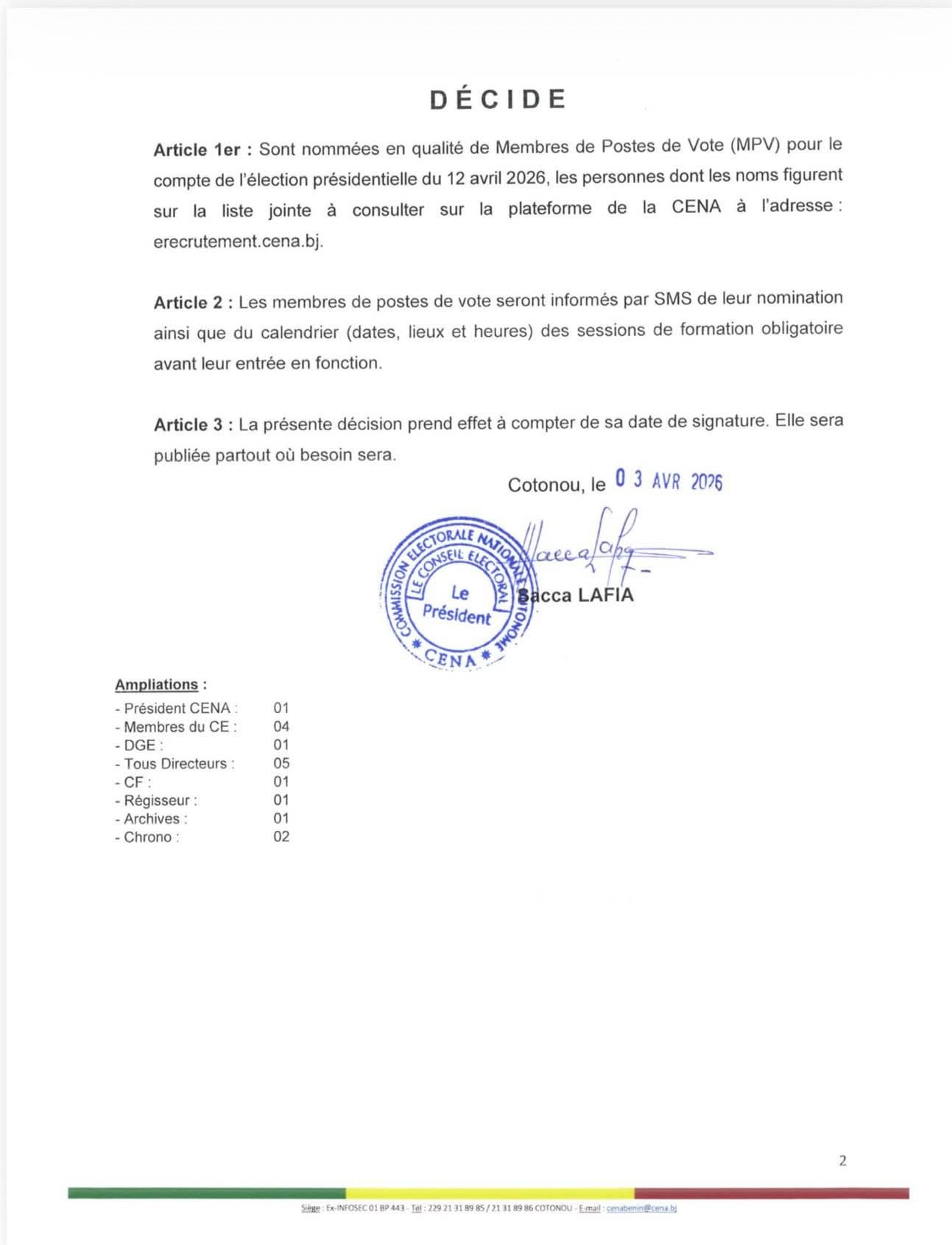 Cette publication fait suite à une décision datée du 3 avril 2026 et signée par le président de l’institution, Sacca Lafia. Elle concerne l’ensemble des agents retenus pour assurer le bon déroulement des opérations électorales sur toute l’étendue du territoire national.