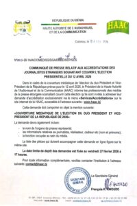 Depuis ce mercredi 4 février, les journalistes étrangers souhaitant couvrir l’événement doivent soumettre leur dossier exclusivement par voie numérique sur le portail officiel de l’institution : www.haac.bj (rubrique « Services/Accréditations »).