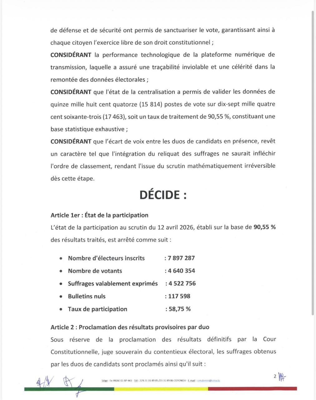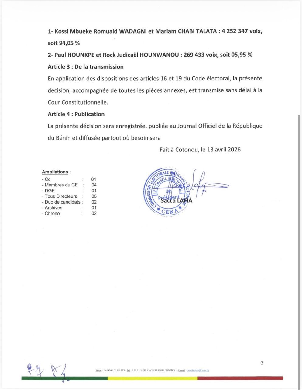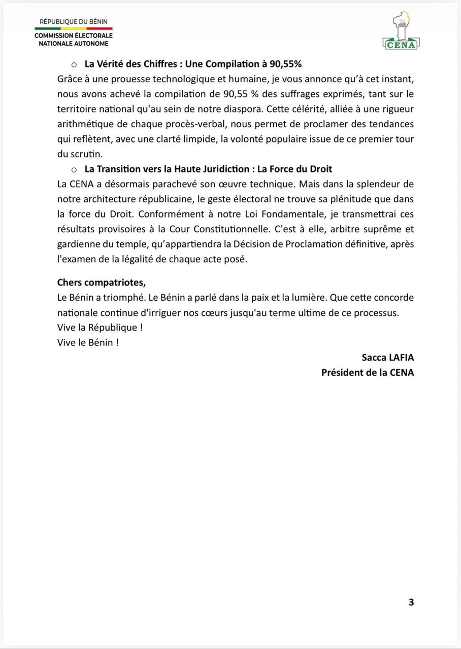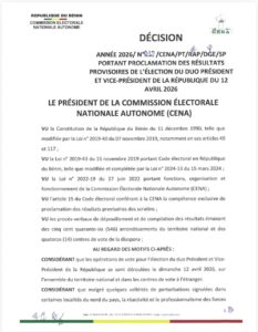 Vingt-quatre heures après le scrutin du 12 avril 2026, la Commission électorale nationale autonome (CENA) a proclamé les résultats provisoires de l’élection présidentielle. S’appuyant sur un système numérique de transmission ayant permis de centraliser plus de 90 % des procès-verbaux, l’institution a rendu publics les premiers chiffres officiels dans la nuit du lundi 13 au mardi 14 avril.