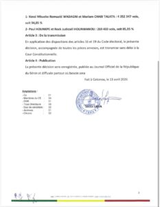 Cette victoire nette confirme les tendances observées dès la fin du vote et ouvre une nouvelle phase politique pour le Bénin, avec l’arrivée au pouvoir de Romuald Wadagni à la tête de l’État.