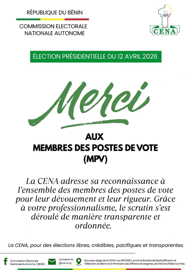 Selon la CENA, leur implication a contribué au bon déroulement des opérations de vote dans l’ensemble des centres, dans un climat marqué par l’ordre et la transparence. Elle souligne également leur rôle essentiel dans le renforcement de la crédibilité du scrutin.