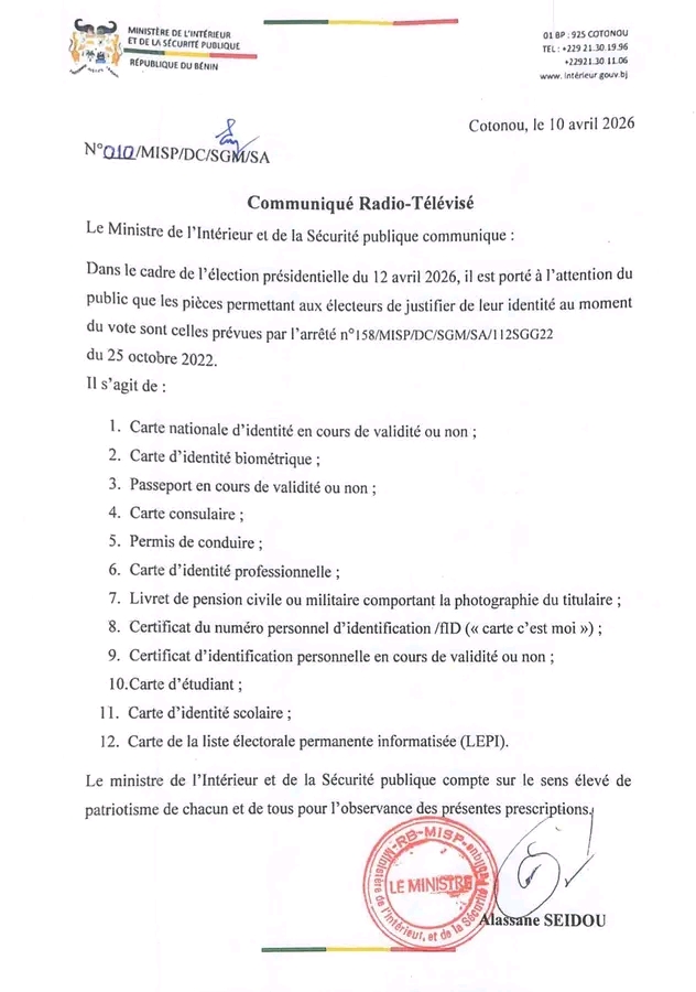 À la veille de l’élection présidentielle prévue ce dimanche 12 avril 2026, le gouvernement béninois précise les conditions d’identification des électeurs. Dans un communiqué rendu public ce vendredi 10 avril, le ministre de l’Intérieur et de la Sécurité publique a rappelé les pièces à présenter dans les bureaux de vote.