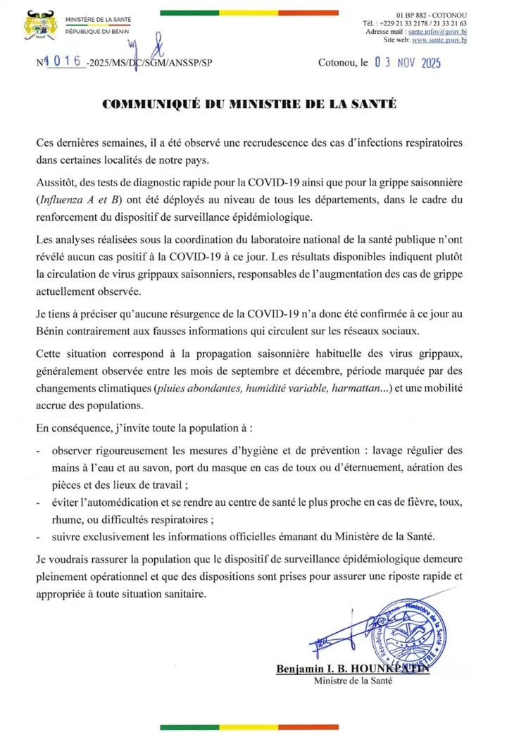 Le Ministère de la Santé a annoncé, à travers un communiqué officiel en date du 3 novembre 2025, une augmentation des cas d’infections respiratoires observée ces dernières semaines dans plusieurs localités du pays. Selon les précisions du communiqué, les analyses effectuées jusqu’à présent n’ont révélé aucun cas positif à la Covid-19.